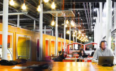A vibrant, collaborative, and neutral working space, where a diverse mix of individuals and organisations connect